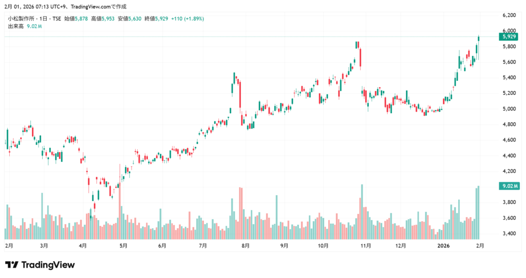 コマツの株価(2026年1月30日終値)は 5,929円。売買単位は100株で、配当金も100株所有すればもらえるようになります。